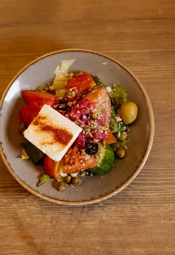 Свежие огурцы, помидоры, болгарский перец, микс-салат, сыр фета, оливки, лук, маслины, оливковое масло